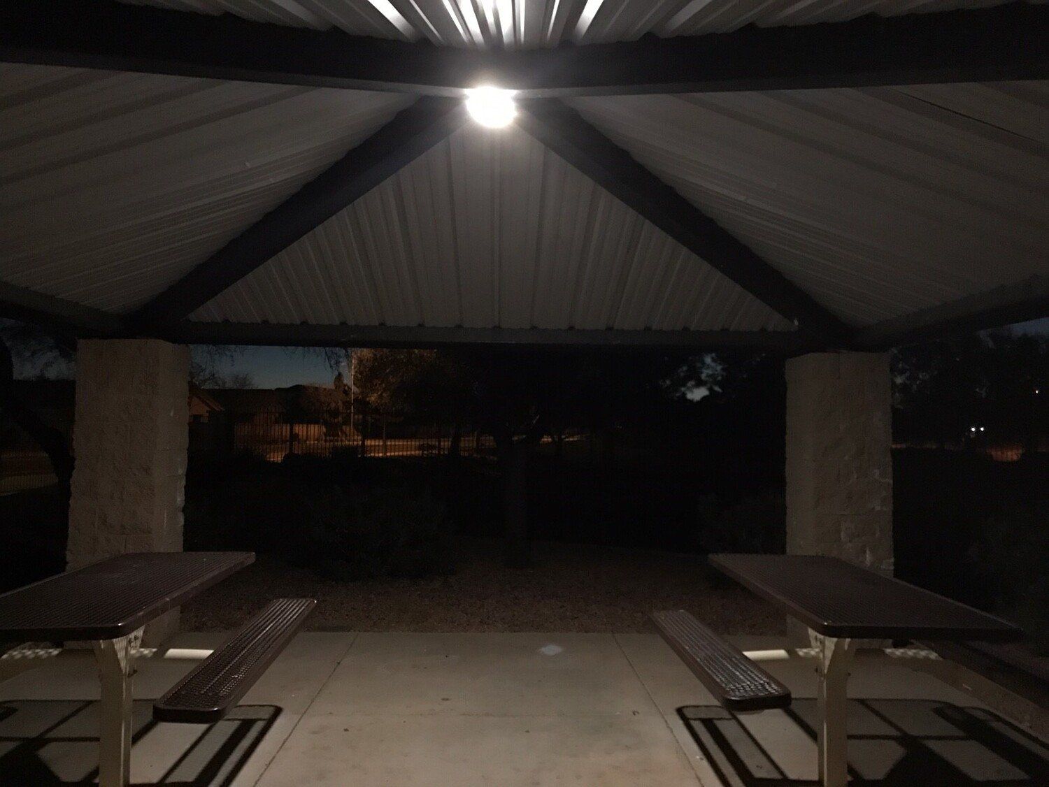SolarKing’s solar-powered ramada lighting system is designed to provide a reasonable amount of lighting under ramadas for the purposes of eating, reading, or visiting. Using the latest in LED technology, the system is rugged and reliable and great-care has been taken to make the system as vandalism-resistant as possible. The systems are designed to run from dusk-to-dawn year-round.